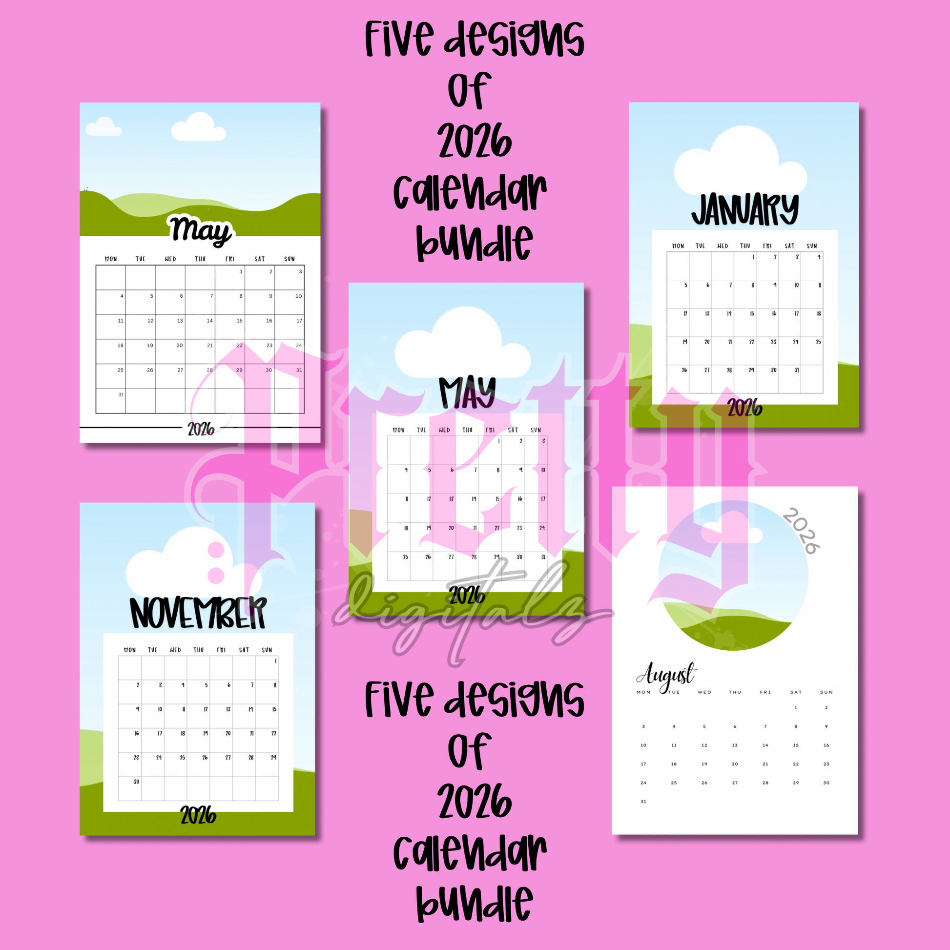 Get organized and inspired with our Bundle of 5 calendars for 2026! Featuring 5 unique designs, this bundle is perfect for planning, tracking, and decorating. With the Canva link, easily customize with your own photos and clipart. Plus, with digital download and PDF link, access and print from anywhere.